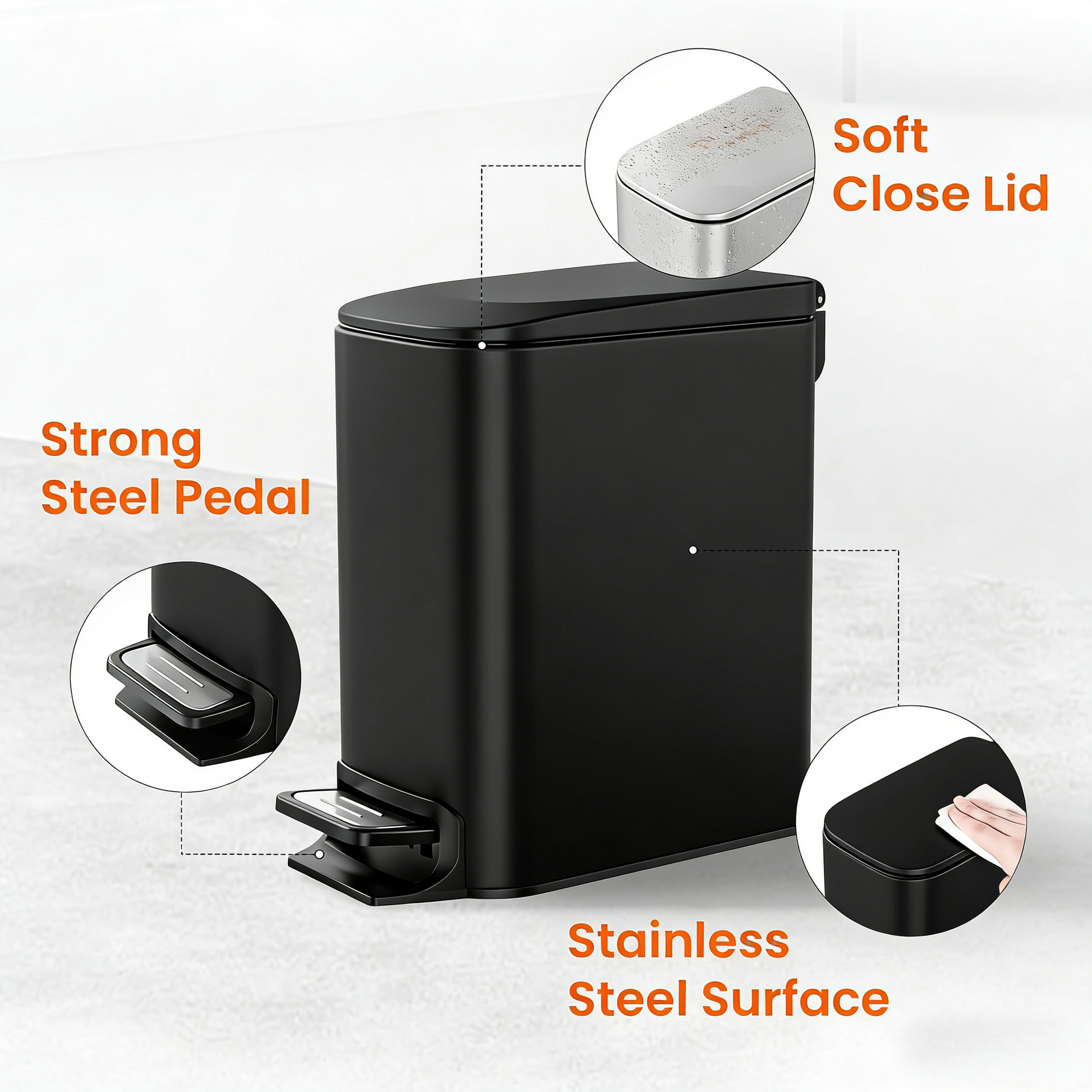 - Anti Rust & No Finger Print: The stainless steel body of the black bathroom trash can looks good, the dirt can be easily cleaned with just water and cloth, and is functional with finger print resistance, making the garbage can still looks like new after long time usage